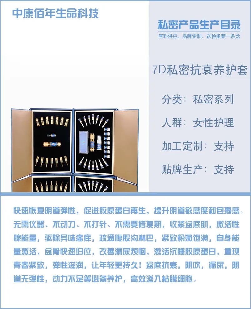 产品:7D私密抗衰养护套 特性:本品对大肠杆菌、金黄色葡萄球菌、白色念珠菌有较高的抑菌作用,在使用时能有效防止细菌感染 规格:展示样品为7次(可根据定制需求做成各种包装) 使用方法:配合专业手法操作。